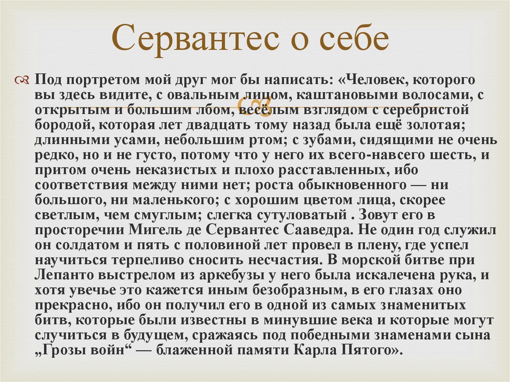Сервантес о себеПод портретом мой друг мог бы написать: «Человек, которого