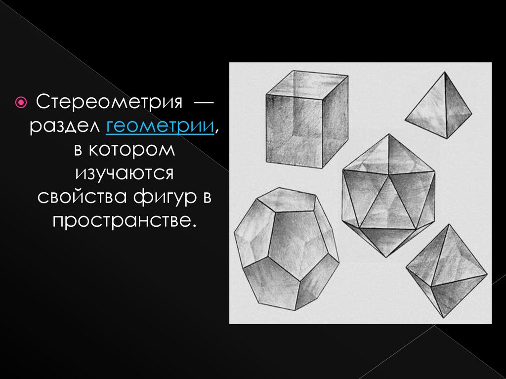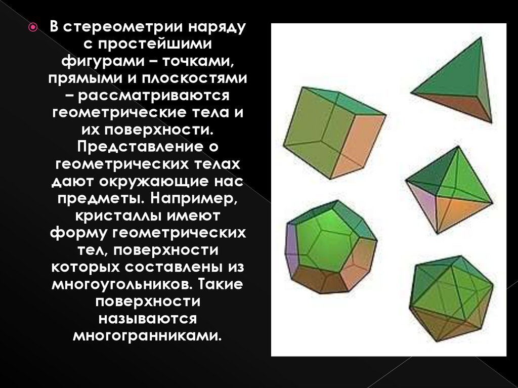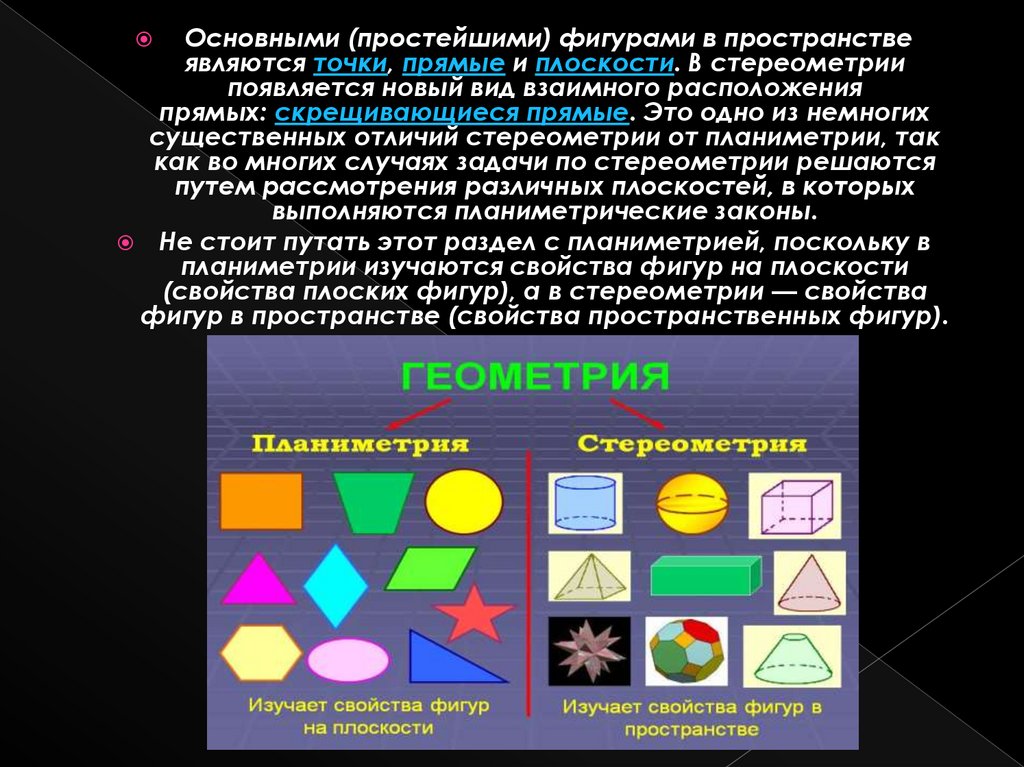 Основными (простейшими) фигурами в пространствеявляются точки, прямые и плоскости. В стереометрии