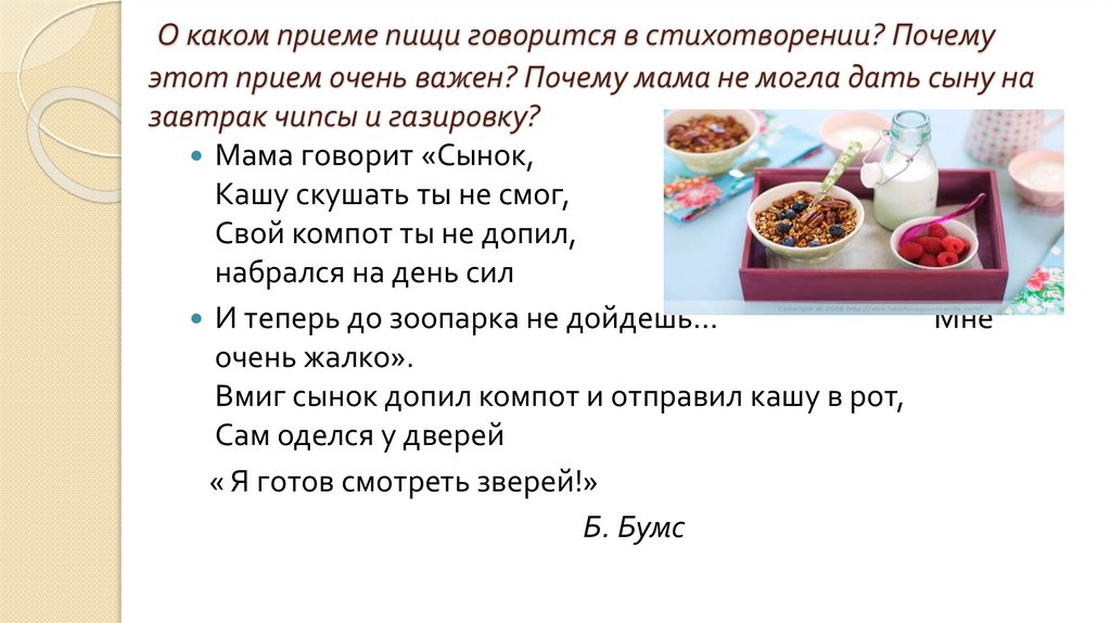 О каком приеме пищи говорится в стихотворении? Почемуэтот прием очень важен? Почему мама не могла дать сыну на