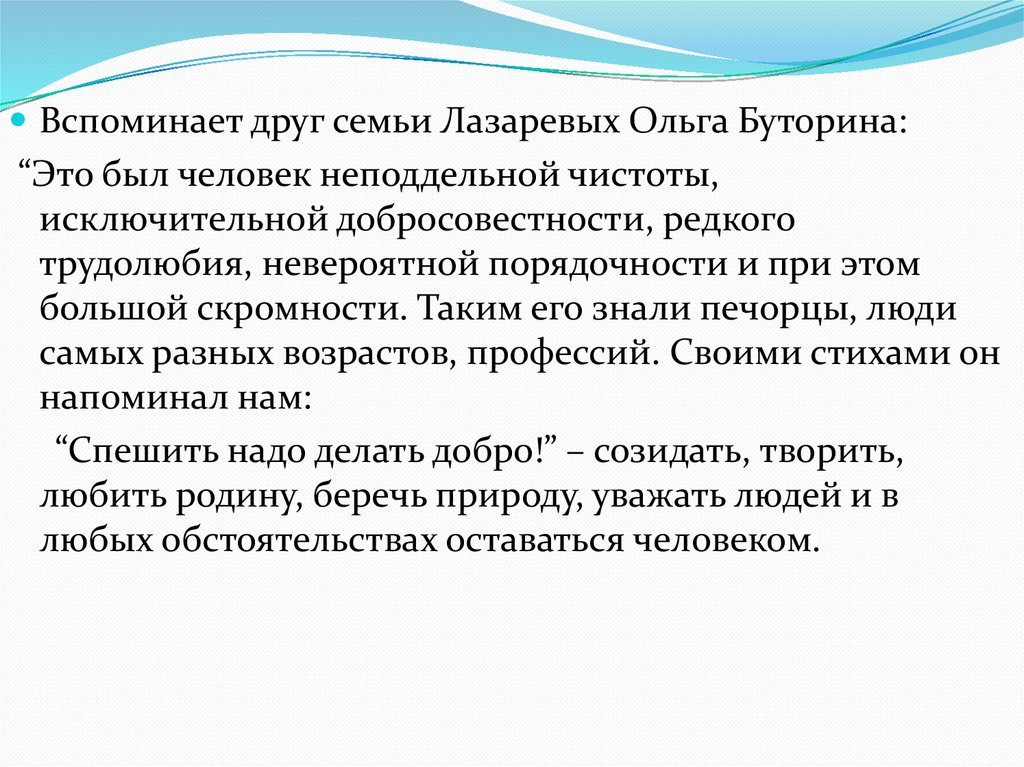 Вспоминает друг семьи Лазаревых Ольга Буторина:“Это был человек неподдельной чистоты,