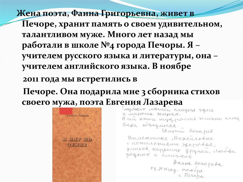 Жена поэта, Фаина Григорьевна, живет вПечоре, хранит память о своем удивительном,