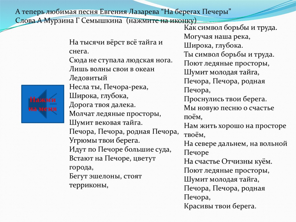 А теперь любимая песня Евгения Лазарева “На берегах Печеры”Слова А Мурзина Г Семышкина (нажмите на иконку)
