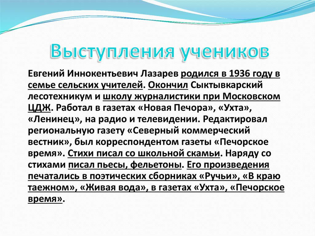 Евгений Иннокентьевич Лазарев родился в 1936 году всемье сельских учителей. Окончил Сыктывкарский