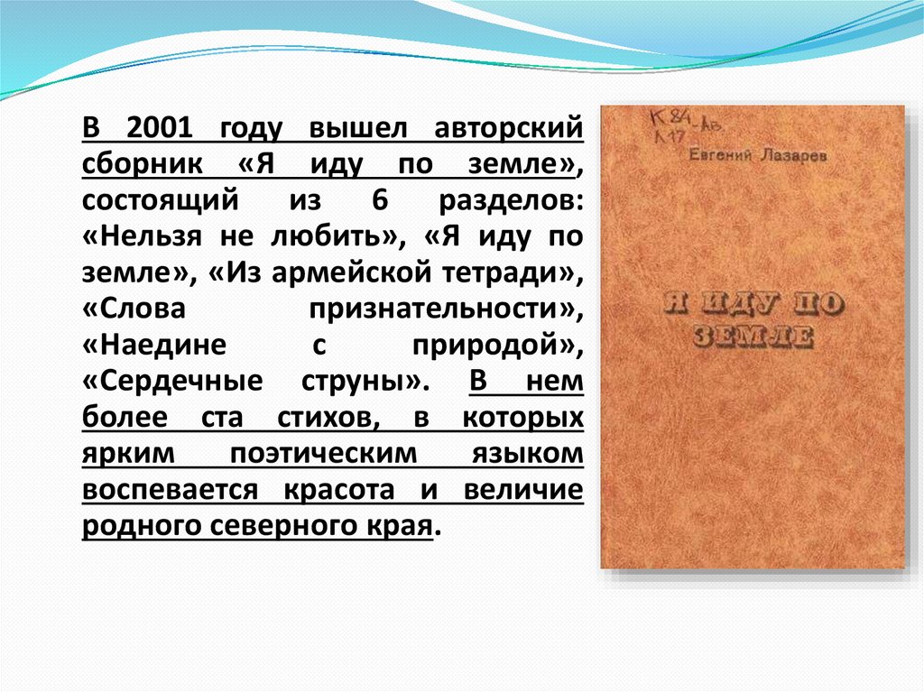 В 2001 году вышел авторскийсборник «Я иду по земле»,