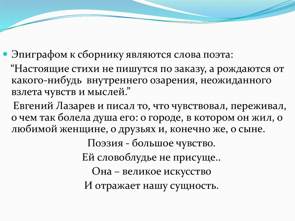 Эпиграфом к сборнику являются слова поэта:“Настоящие стихи не пишутся по заказу, а рождаются от