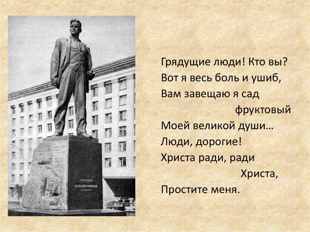 Грядущие люди! Кто вы?Вот я весь боль и ушиб,