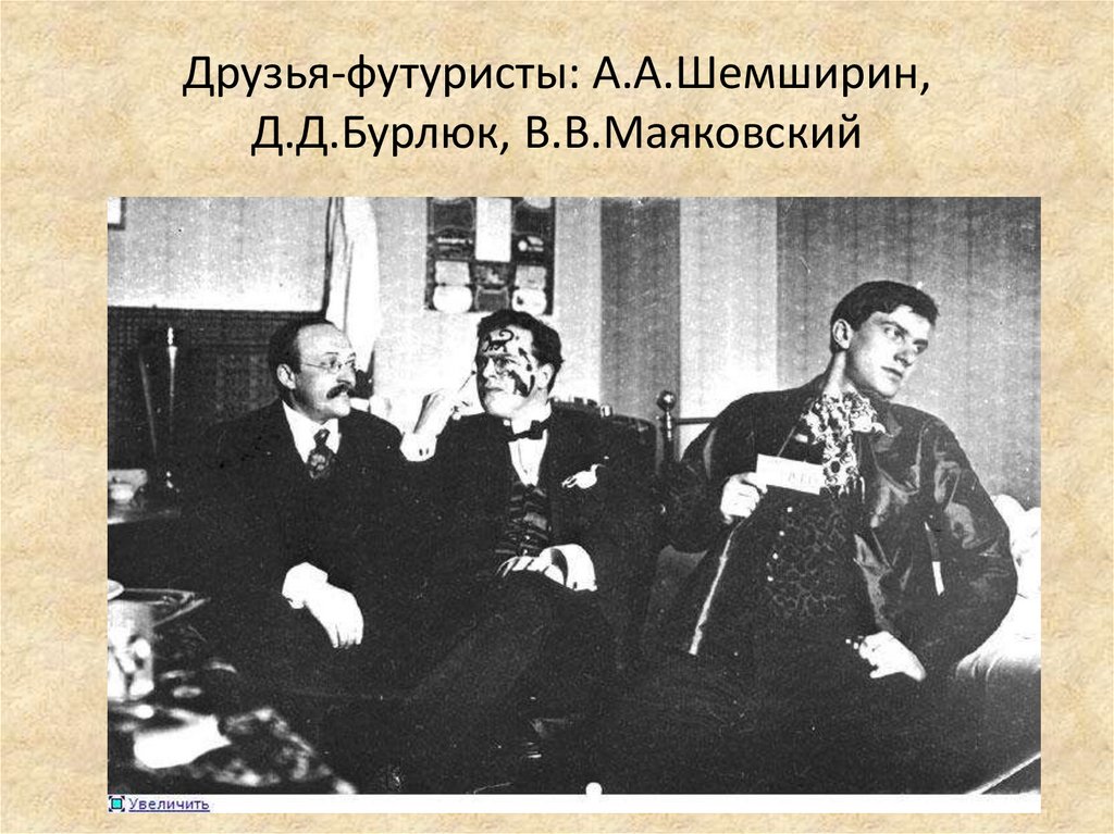 Друзья-футуристы: А.А.Шемширин,Д.Д.Бурлюк, В.В.Маяковский