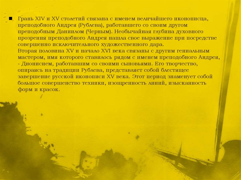 Грань XIV и XV столетий связана с именем величайшего иконописца,преподобного Андрея (Рублева), работавшего со своим другом