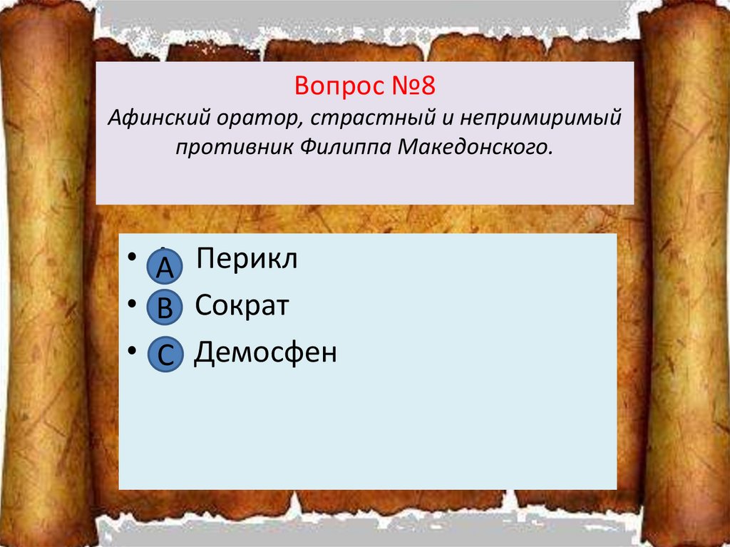 Вопрос №8Афинский оратор, страстный и непримиримый