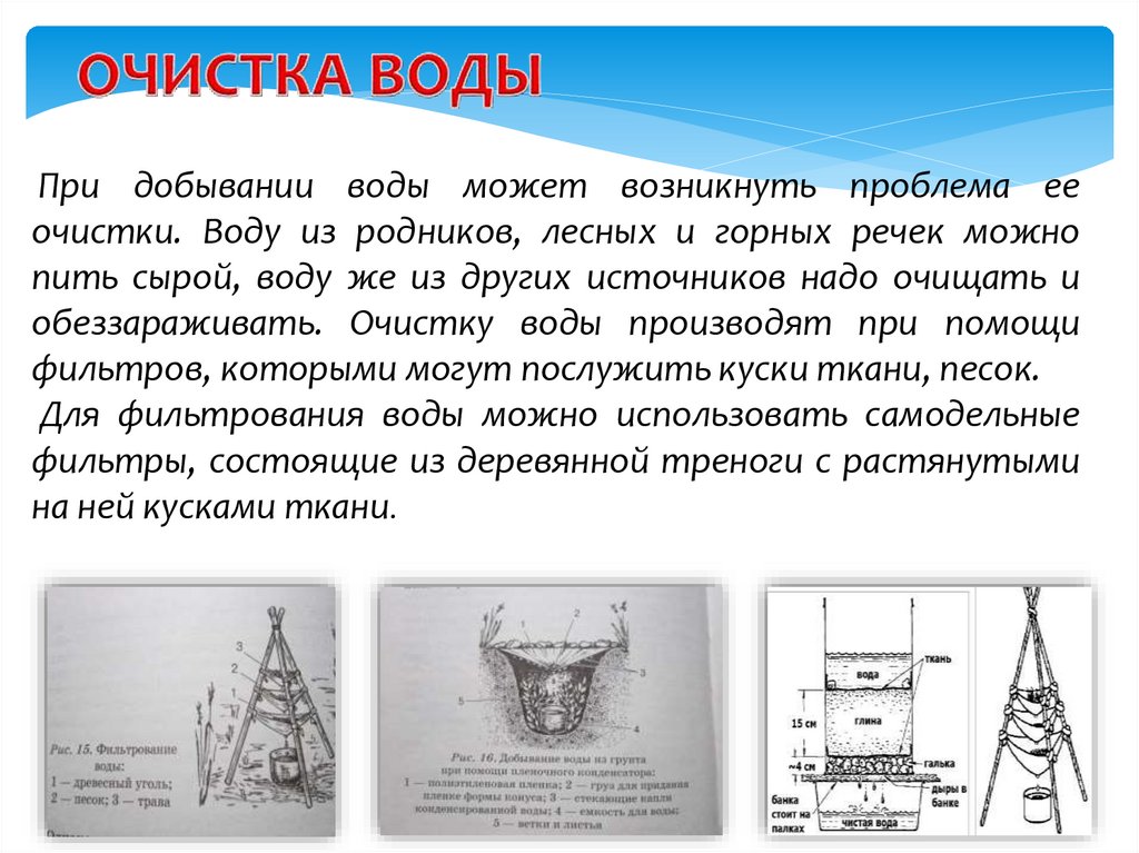 При добывании воды может возникнуть проблема ееочистки. Воду из родников, лесных и горных речек можно
