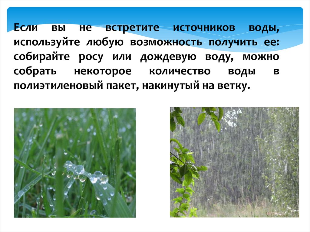 Если вы не встретите источников воды,используйте любую возможность получить ее: