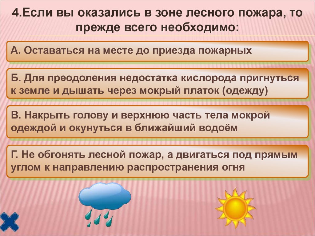 4.Если вы оказались в зоне лесного пожара, топрежде всего необходимо: