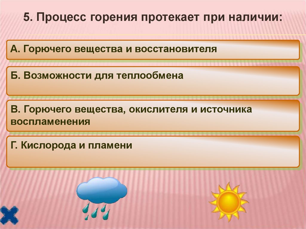 5. Процесс горения протекает при наличии:А. Горючего вещества и восстановителя