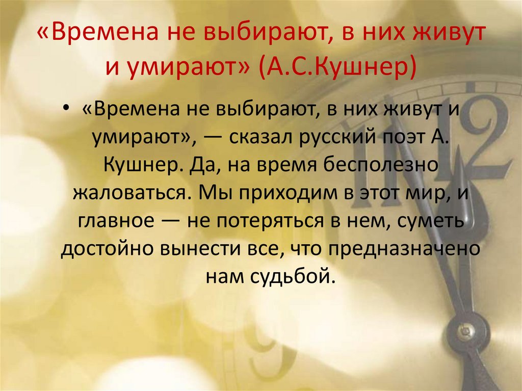 «Времена не выбирают, в них живути умирают» (А.С.Кушнер)
