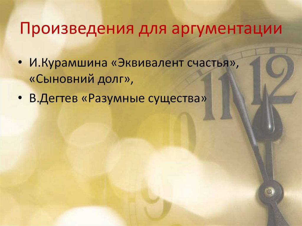 Произведения для аргументации• И.Курамшина «Эквивалент счастья»,