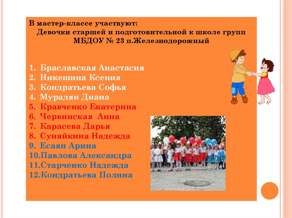 В мастер-классе участвуют:Девочки старшей и подготовительной к школе групп