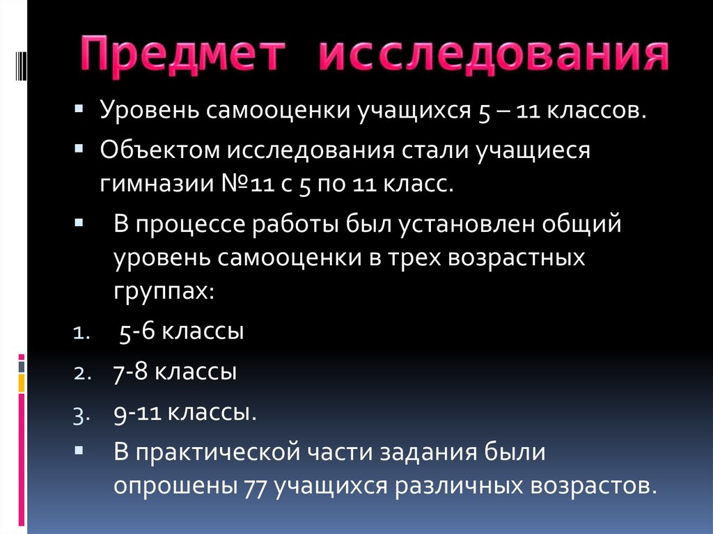 Уровень самооценки учащихся 5 – 11 классов.Объектом исследования стали учащиеся