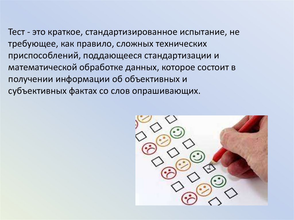 Тест - это краткое, стандартизированное испытание, нетребующее, как правило, сложных технических