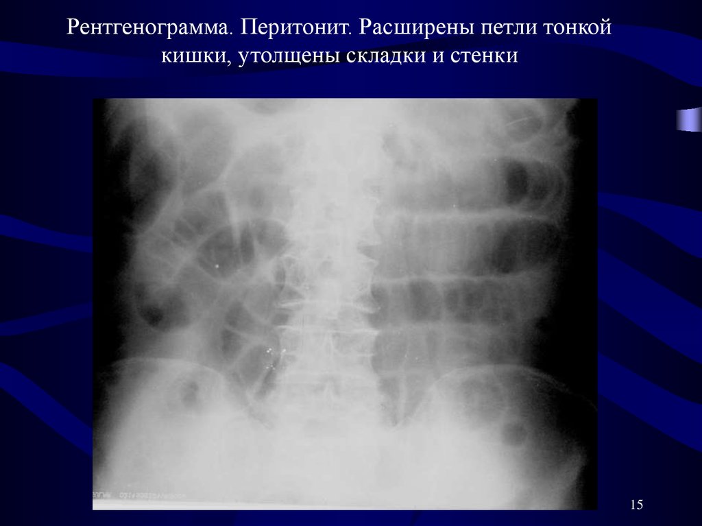 Рентгенограмма. Перитонит. Расширены петли тонкойкишки, утолщены складки и стенки