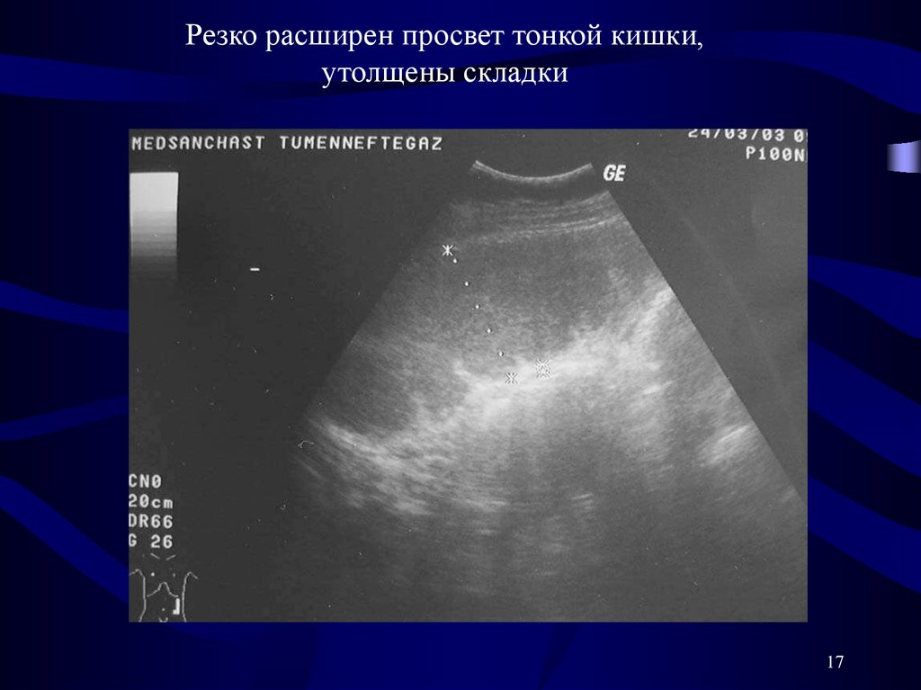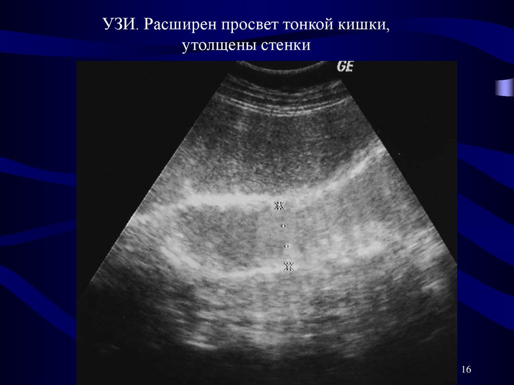 УЗИ. Расширен просвет тонкой кишки,утолщены стенки