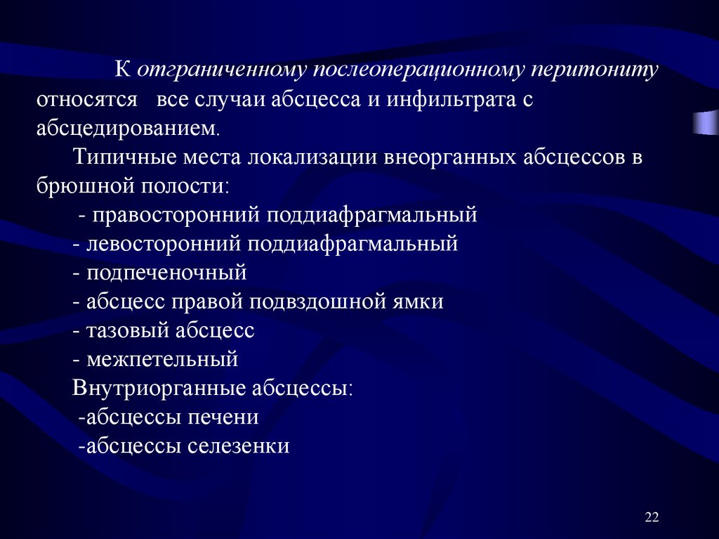 К отграниченному послеоперационному перитонитуотносятся все случаи абсцесса и инфильтрата с