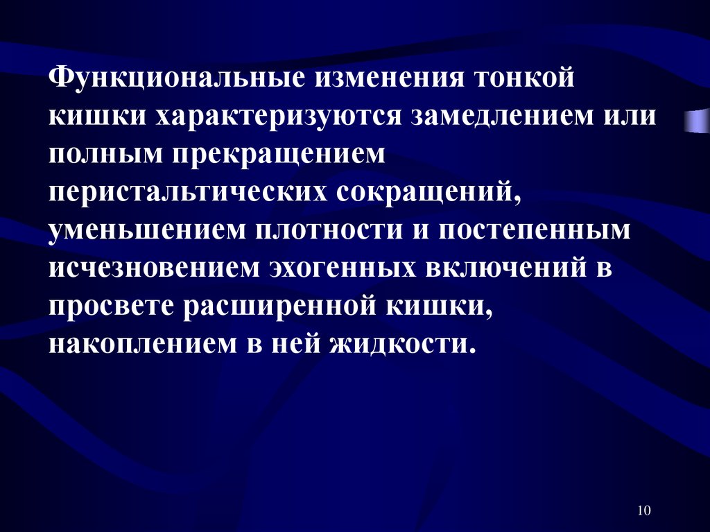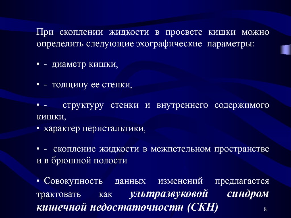 При скоплении жидкости в просвете кишки можноопределить следующие эхографические параметры:
