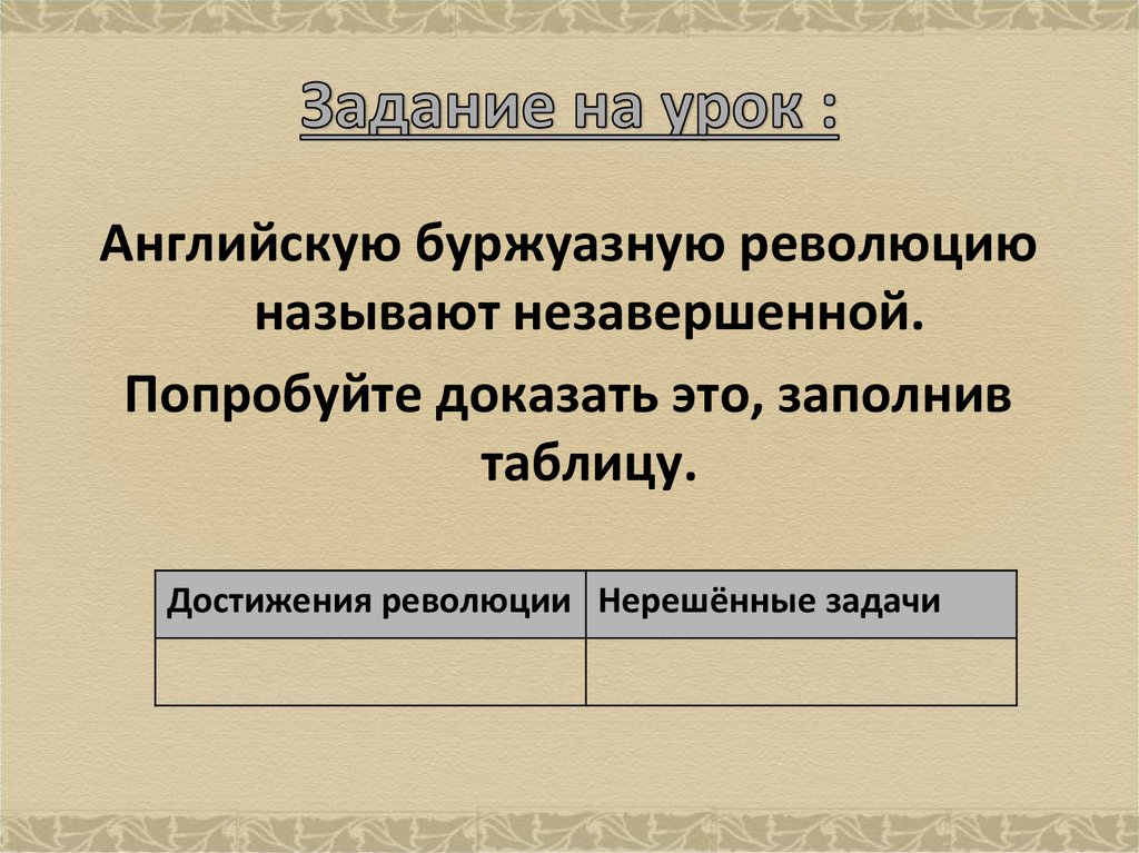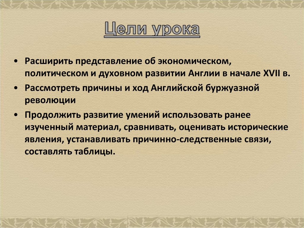 • Расширить представление об экономическом,политическом и духовном развитии Англии в начале XVII в.