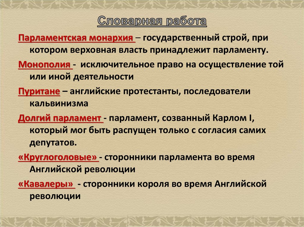 Парламентская монархия – государственный строй, прикотором верховная власть принадлежит парламенту.