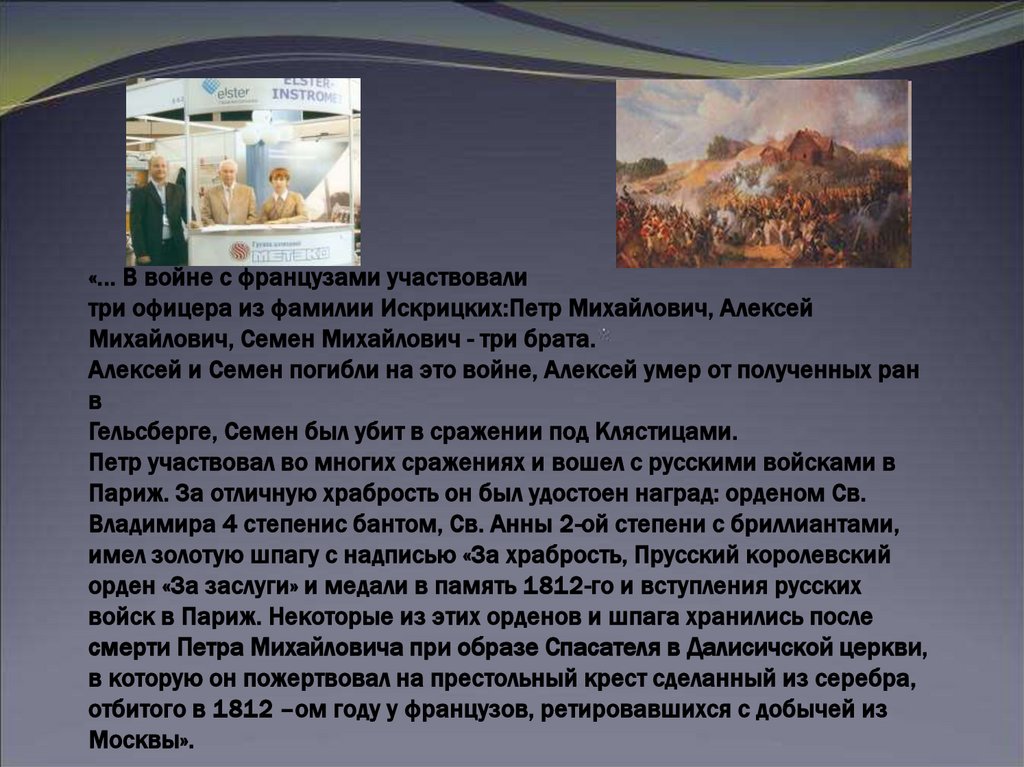 «… В войне с французами участвовалитри офицера из фамилии Искрицких:Петр Михайлович, Алексей
