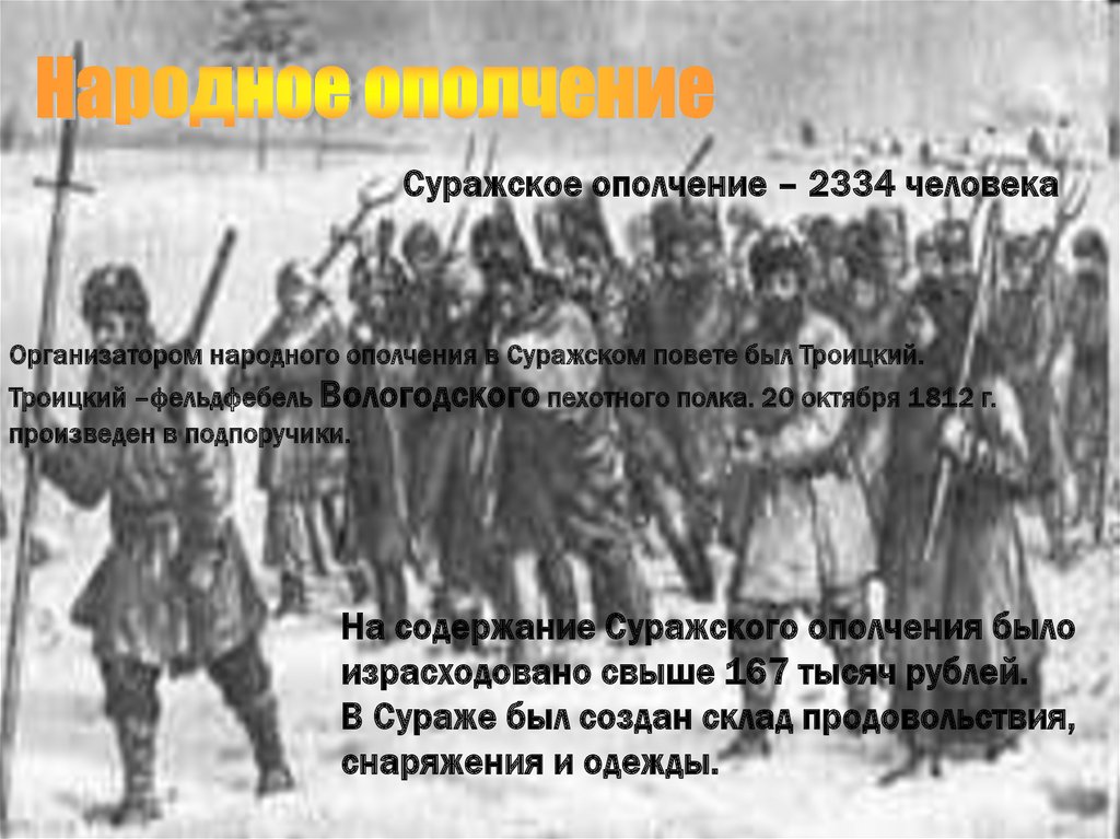Суражское ополчение – 2334 человекаОрганизатором народного ополчения в Суражском повете был Троицкий.