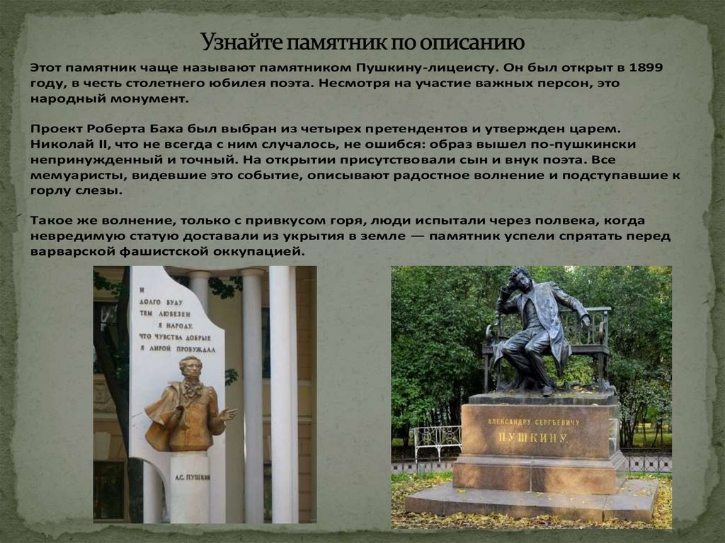 Этот памятник чаще называют памятником Пушкину-лицеисту. Он был открыт в 1899году, в честь столетнего юбилея поэта. Несмотря на участие важных персон, это