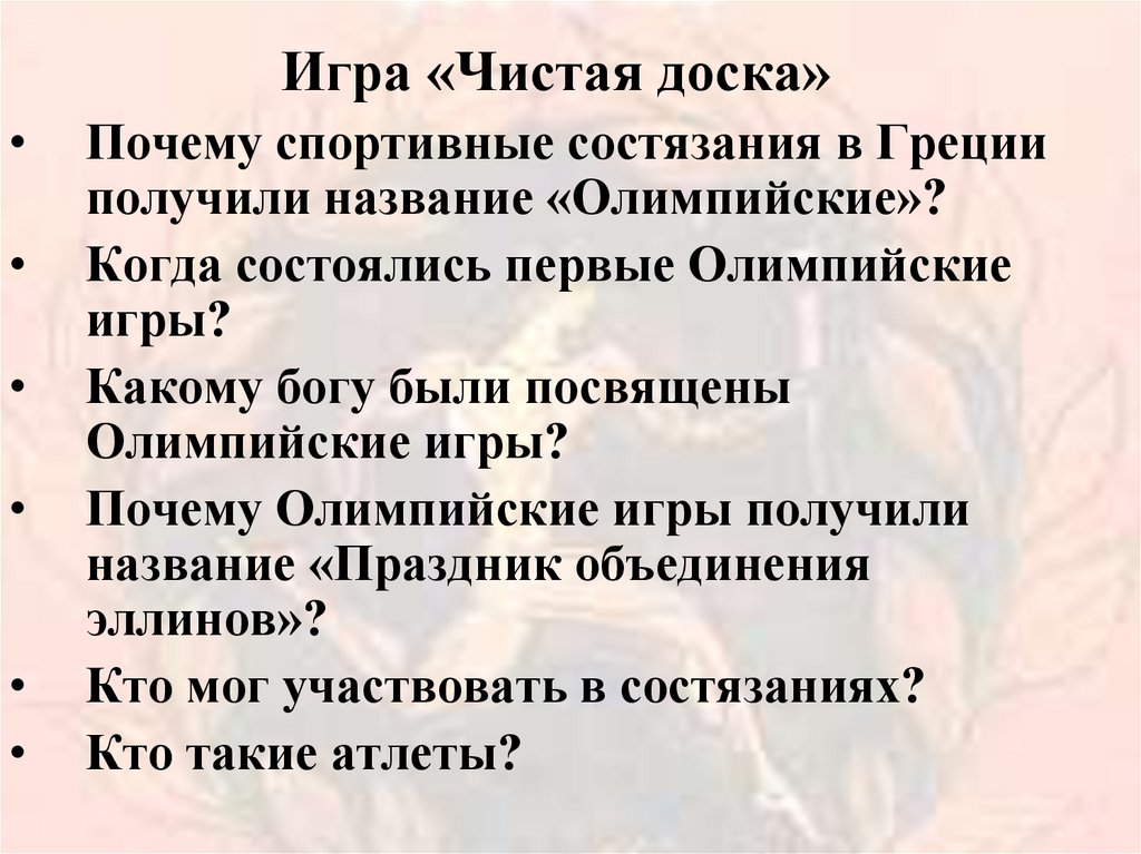 Игра «Чистая доска»Почему спортивные состязания в Греции