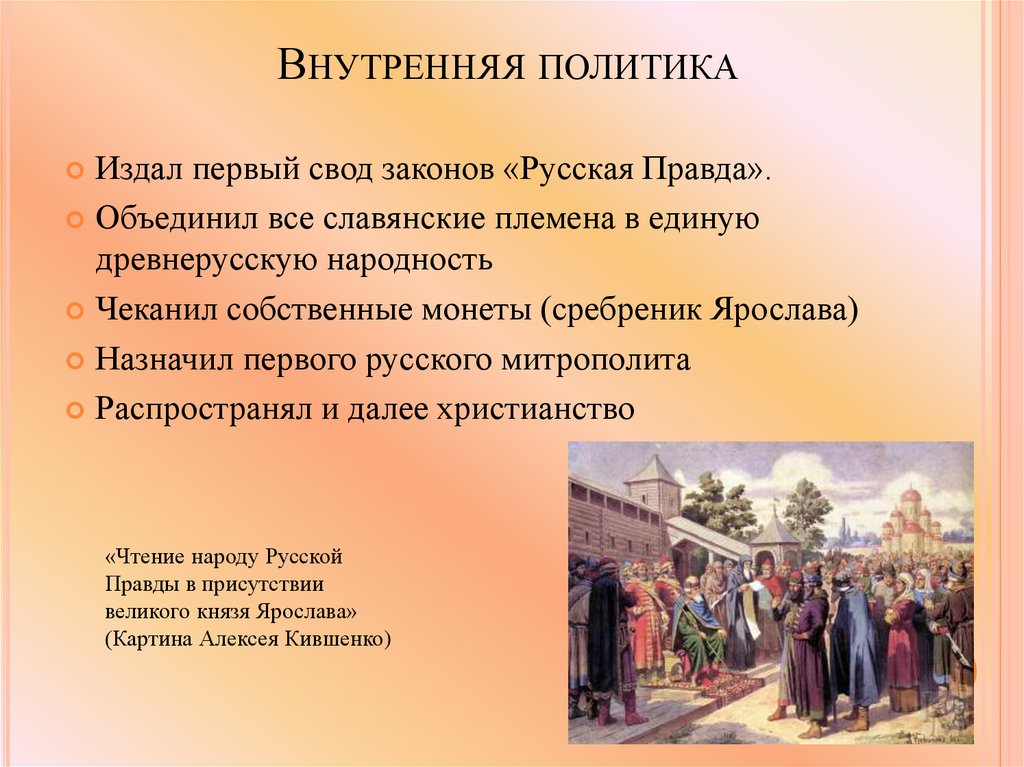 ВНУТРЕННЯЯ ПОЛИТИКАИздал первый свод законов «Русская Правда».