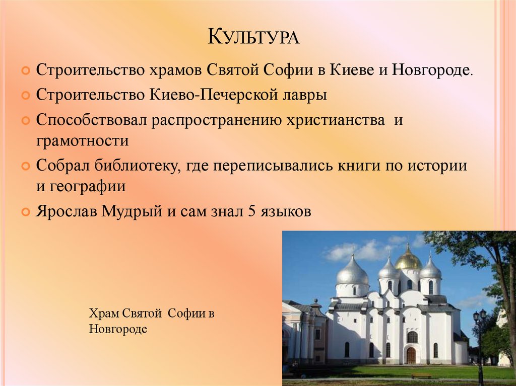 КУЛЬТУРАСтроительство храмов Святой Софии в Киеве и Новгороде.