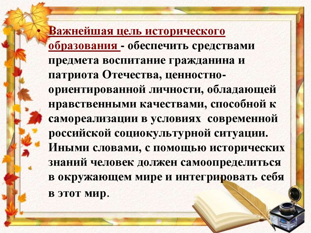 • Важнейшая цель историческогообразования - обеспечить средствами
