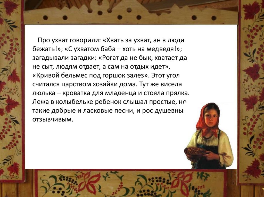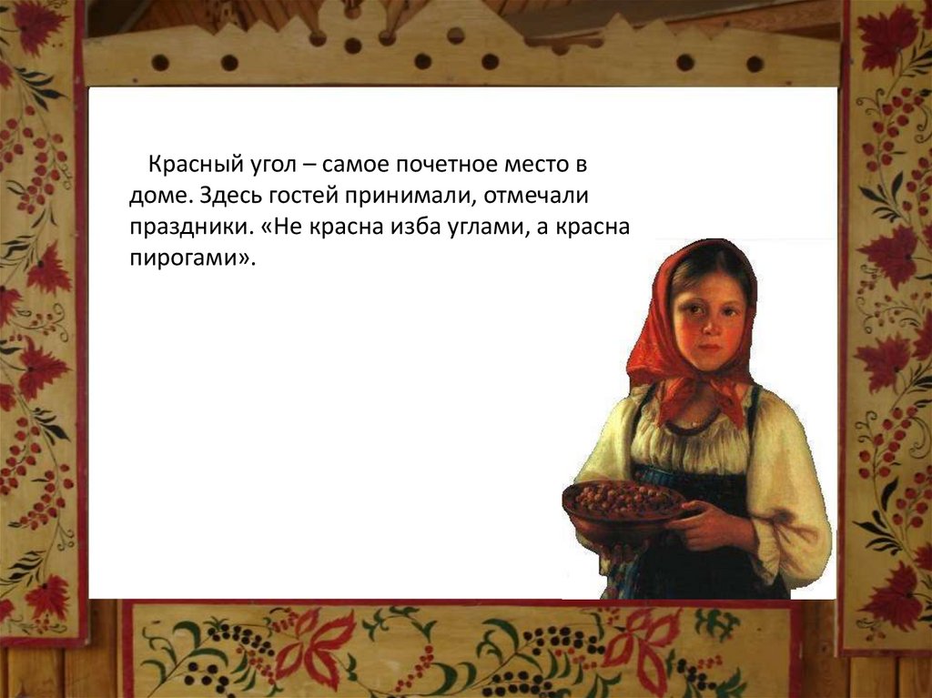 Красный угол – самое почетное место в доме. Здесьгостей принимали, отмечали праздники. «Не красна