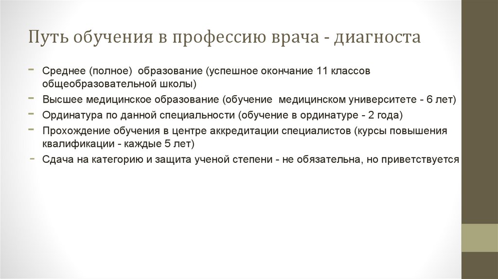 Путь обучения в профессию врача - диагноста- Среднее (полное) образование (успешное окончание 11 классов
