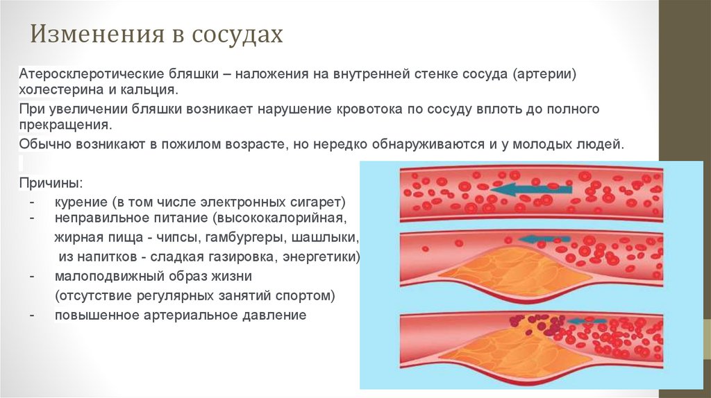 Изменения в сосудахАтеросклеротические бляшки – наложения на внутренней стенке сосуда (артерии)