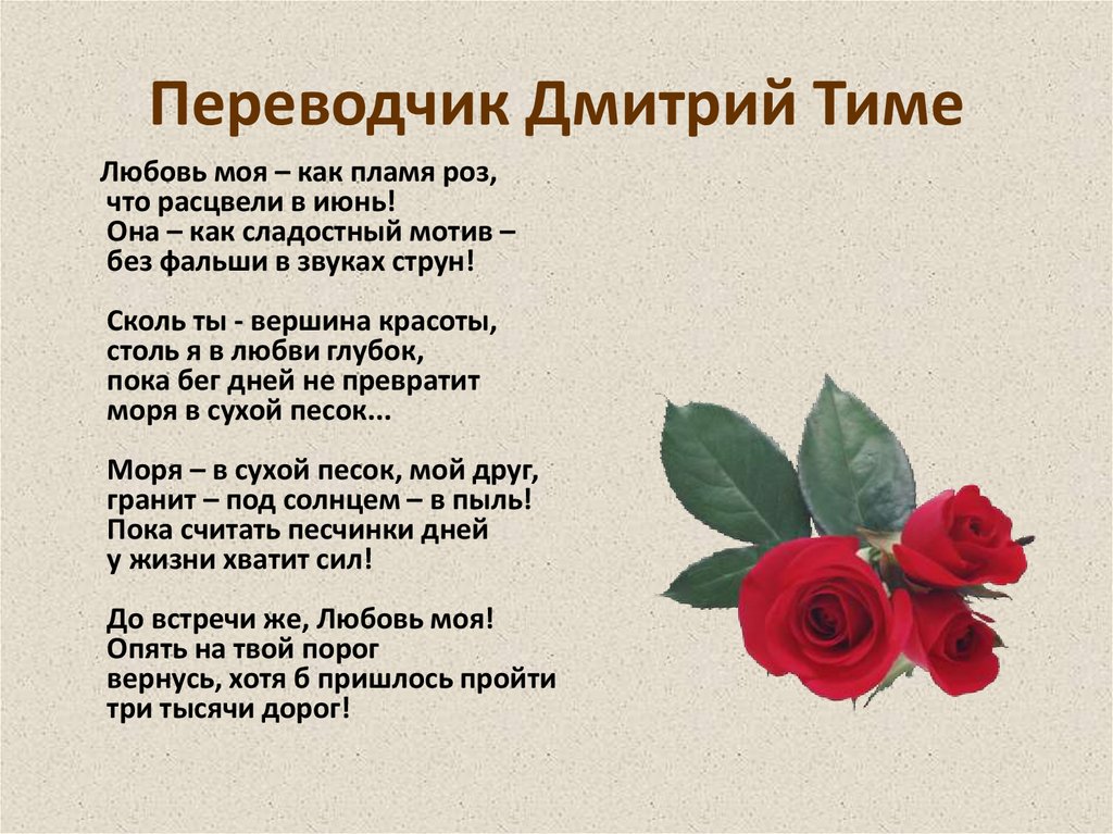 Переводчик Дмитрий ТимеЛюбовь моя – как пламя роз,