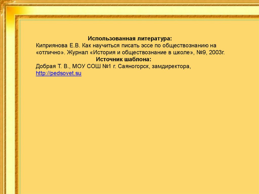 Использованная литература:Киприянова Е.В. Как научиться писать эссе по обществознанию на