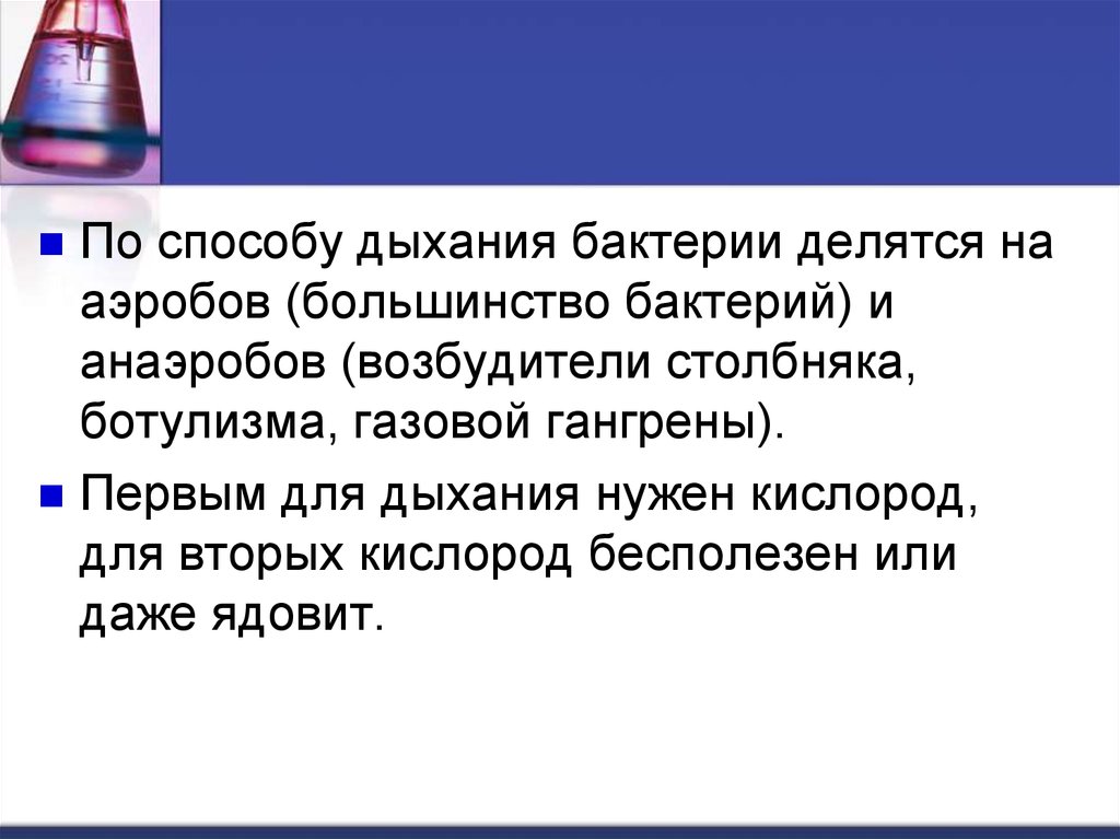 По способу дыхания бактерии делятся нааэробов (большинство бактерий) и