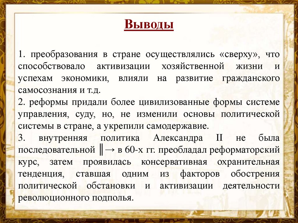 Выводы1. преобразования в стране осуществлялись «сверху», что