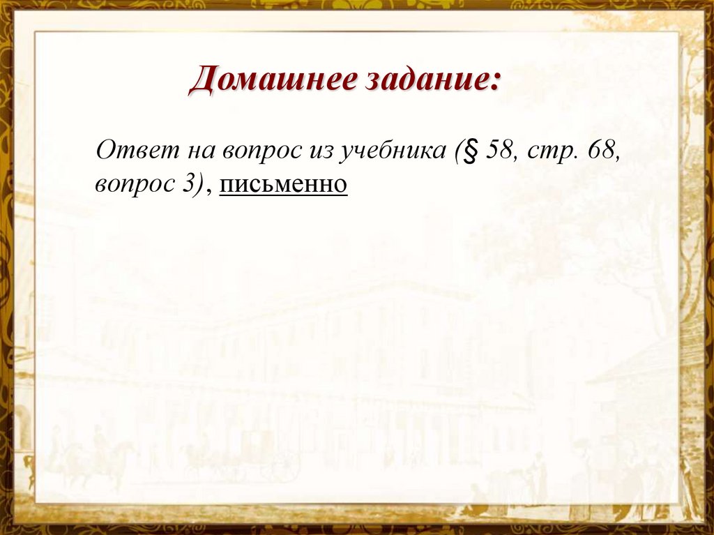 Домашнее задание:Ответ на вопрос из учебника (§ 58, стр. 68,