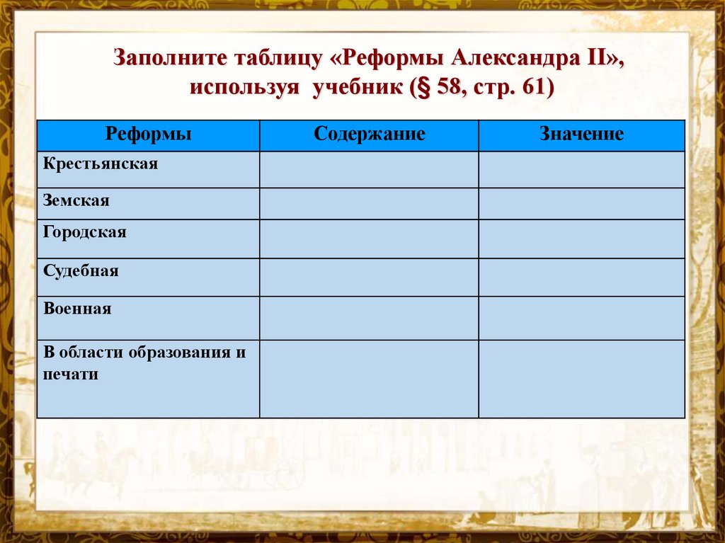 Заполните таблицу «Реформы Александра II»,используя учебник (§ 58, стр. 61)