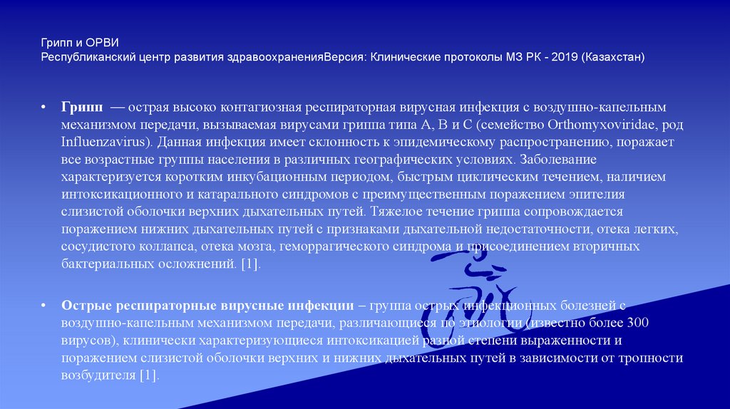 Грипп и ОРВИРеспубликанский центр развития здравоохраненияВерсия: Клинические протоколы МЗ РК - 2019 (Казахстан)