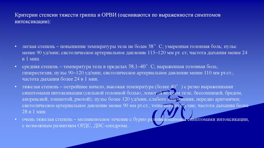 Критерии степени тяжести гриппа и ОРВИ (оцениваются по выраженности симптомовинтоксикации):