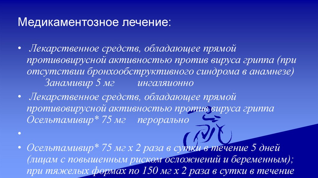 • Осельтамивир* 75 мг х 2 раза в сутки в течение 5 дней