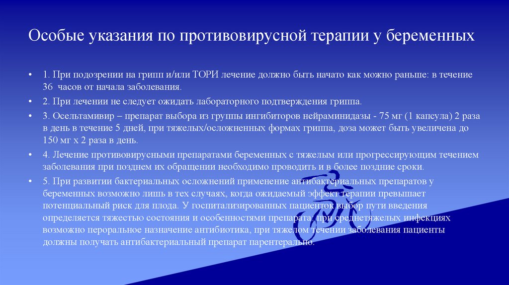 Особые указания по противовирусной терапии у беременных1. При подозрении на грипп и/или ТОРИ лечение должно быть начато как можно раньше: в течение
