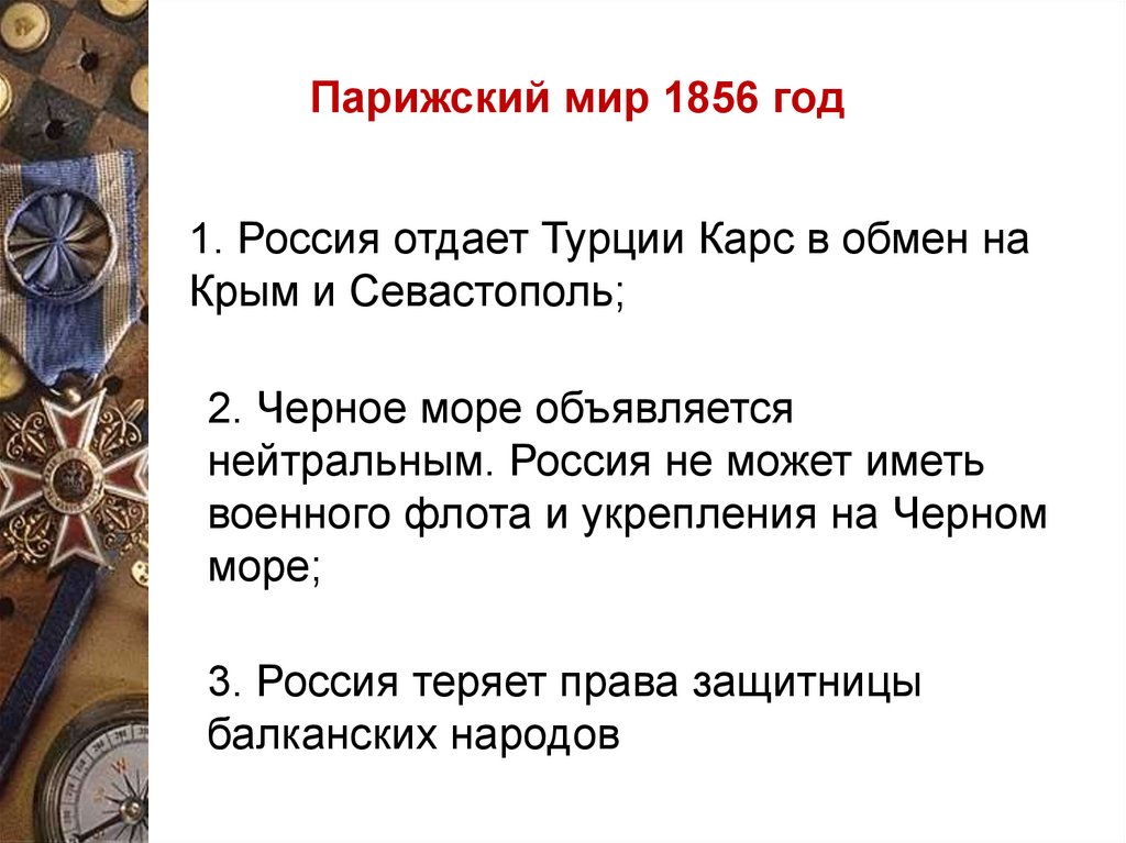 Парижский мир 1856 год1. Россия отдает Турции Карс в обмен на