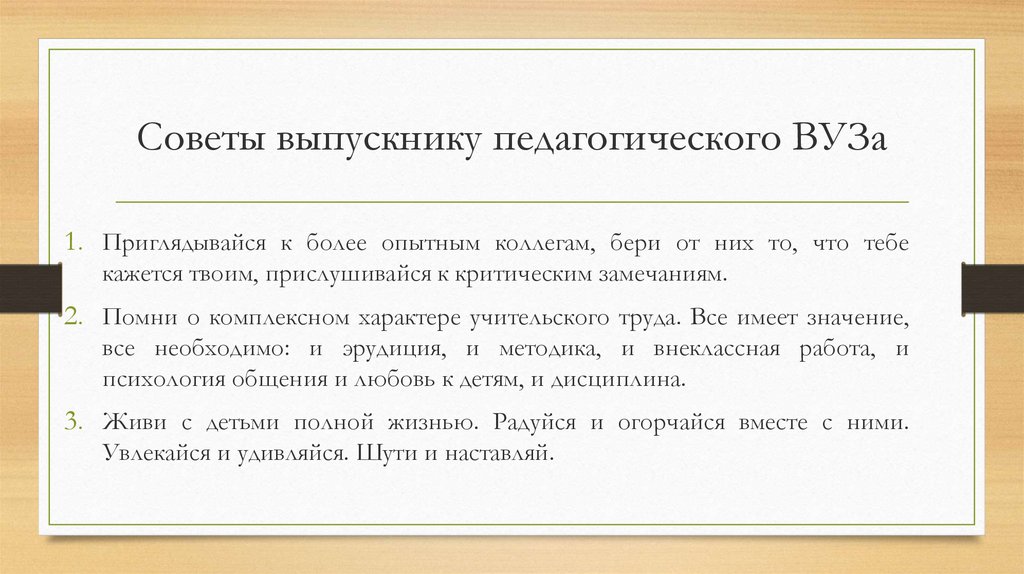Советы выпускнику педагогического ВУЗа1. Приглядывайся к более опытным коллегам, бери от них то, что тебе